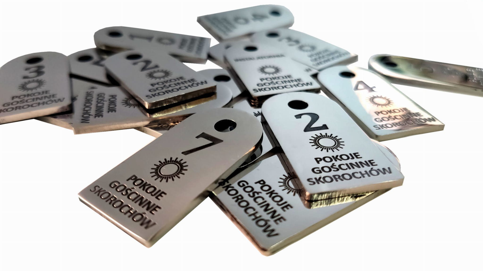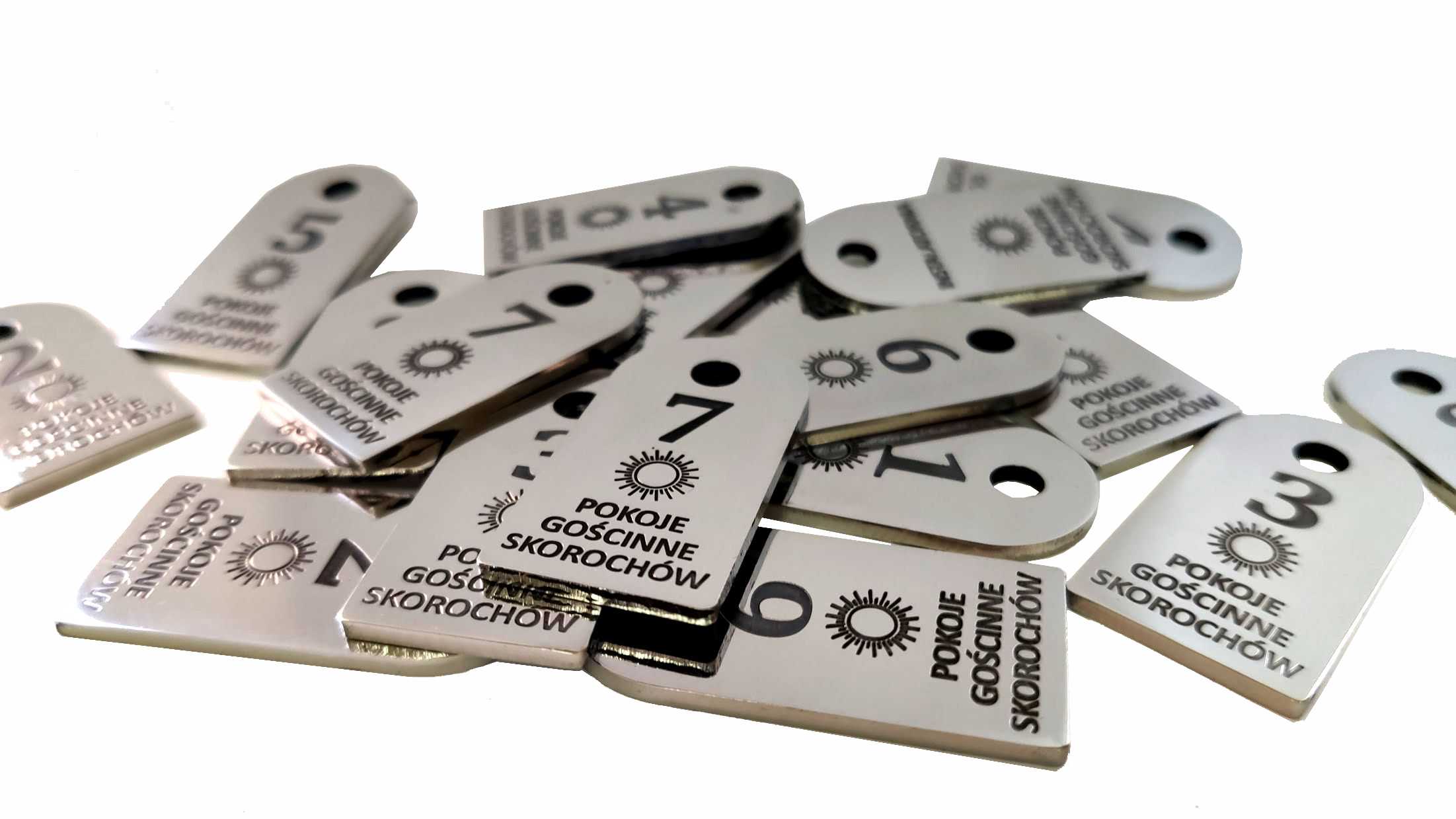 Na brelokach grawerujemy dowolną treść, numerację, telefony, stronę www państwa hotelu, pensjonatu, hostelu.