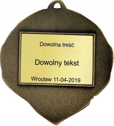 Tył medalu widoczny na zdjęciu obok z przykładową tabliczką z laminatu grawerskiego w kolorze medalu.