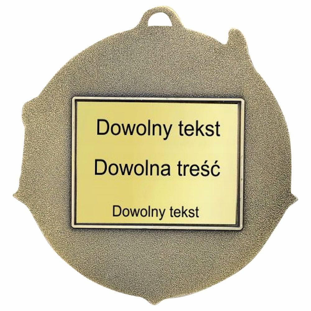 Tył medalu widoczny na zdjęciu obok z przykładową tabliczką z laminatu grawerskiego w kolorze medalu.