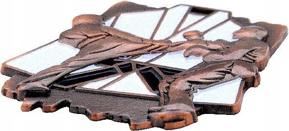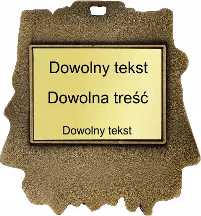 Tył medalu widoczny na zdjęciu obok z przykładową tabliczką z laminatu grawerskiego w kolorze medalu.