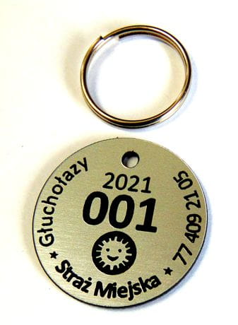 Brelok jest wykoanany z laminatu grawerskiego o wymiarach 55x34mm. Grubość laminatu 1,6mm. W komplecie stalowe kółko do podpięcia kluczy.