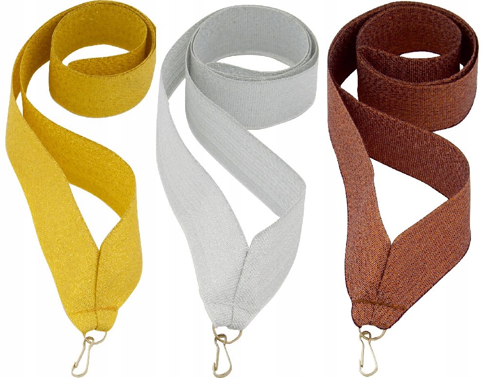Wstążki w kolorach odpowiednich do zajętych miejsc, złota, srebra i brązowa o szerokości 22mm zakończona karabińczykiem w kolorze złotym.