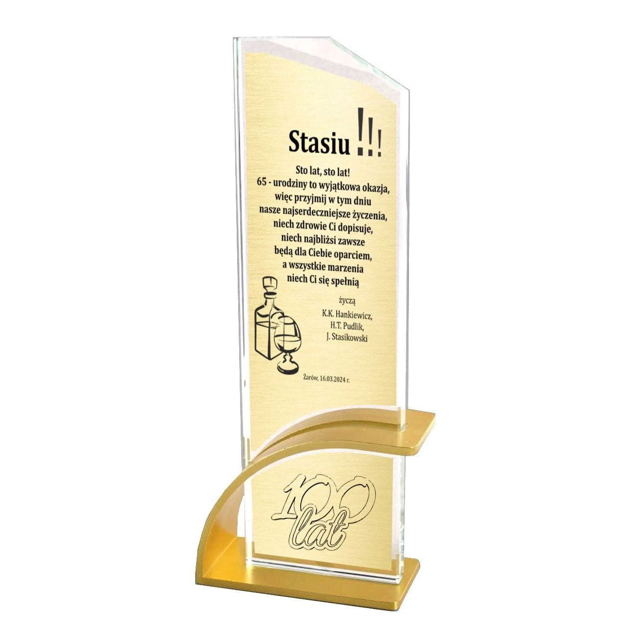 Oferta obejmuje bardzo efektowną z przepięknymi szlifami szklaną statuetkę z dowolnym grawerem.