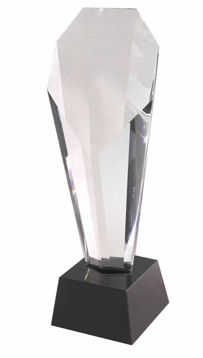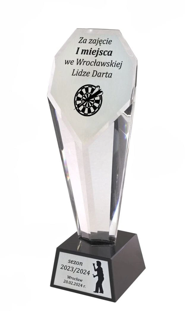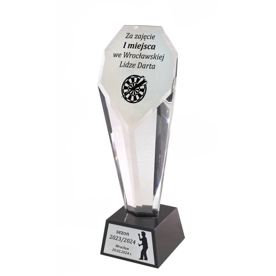 Oferta obejmuje bardzo efektowną z przepięknymi szlifami szklaną statuetkę z dowolnym grawerem.
